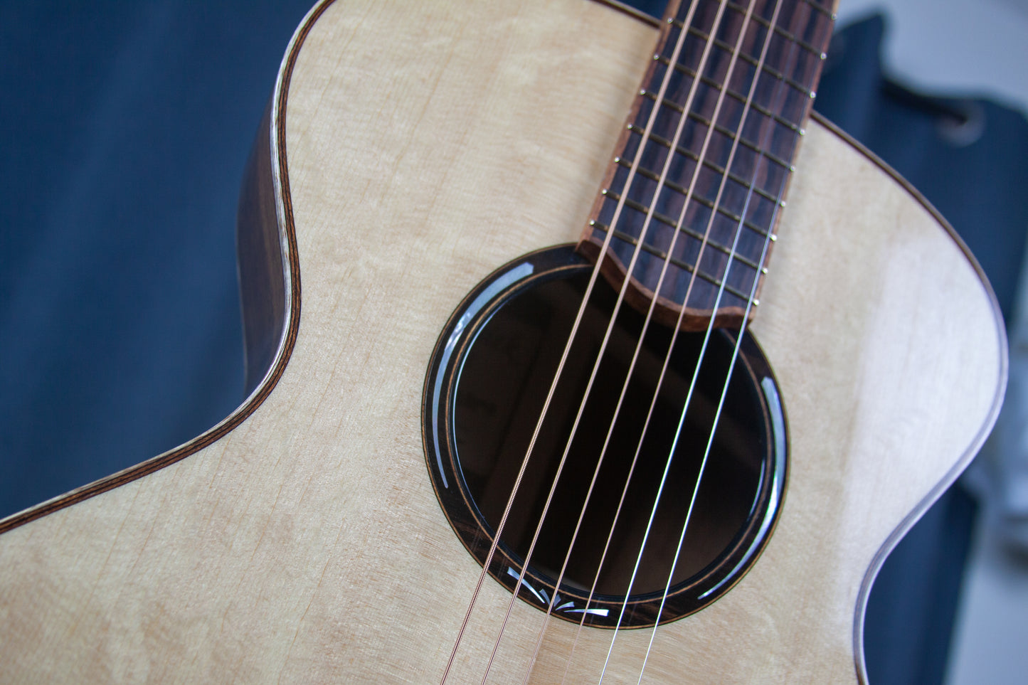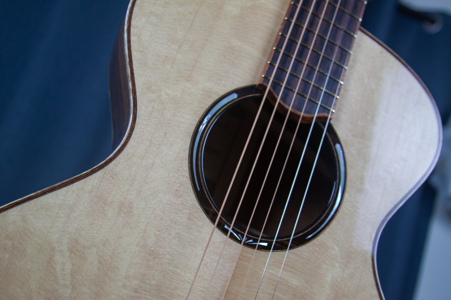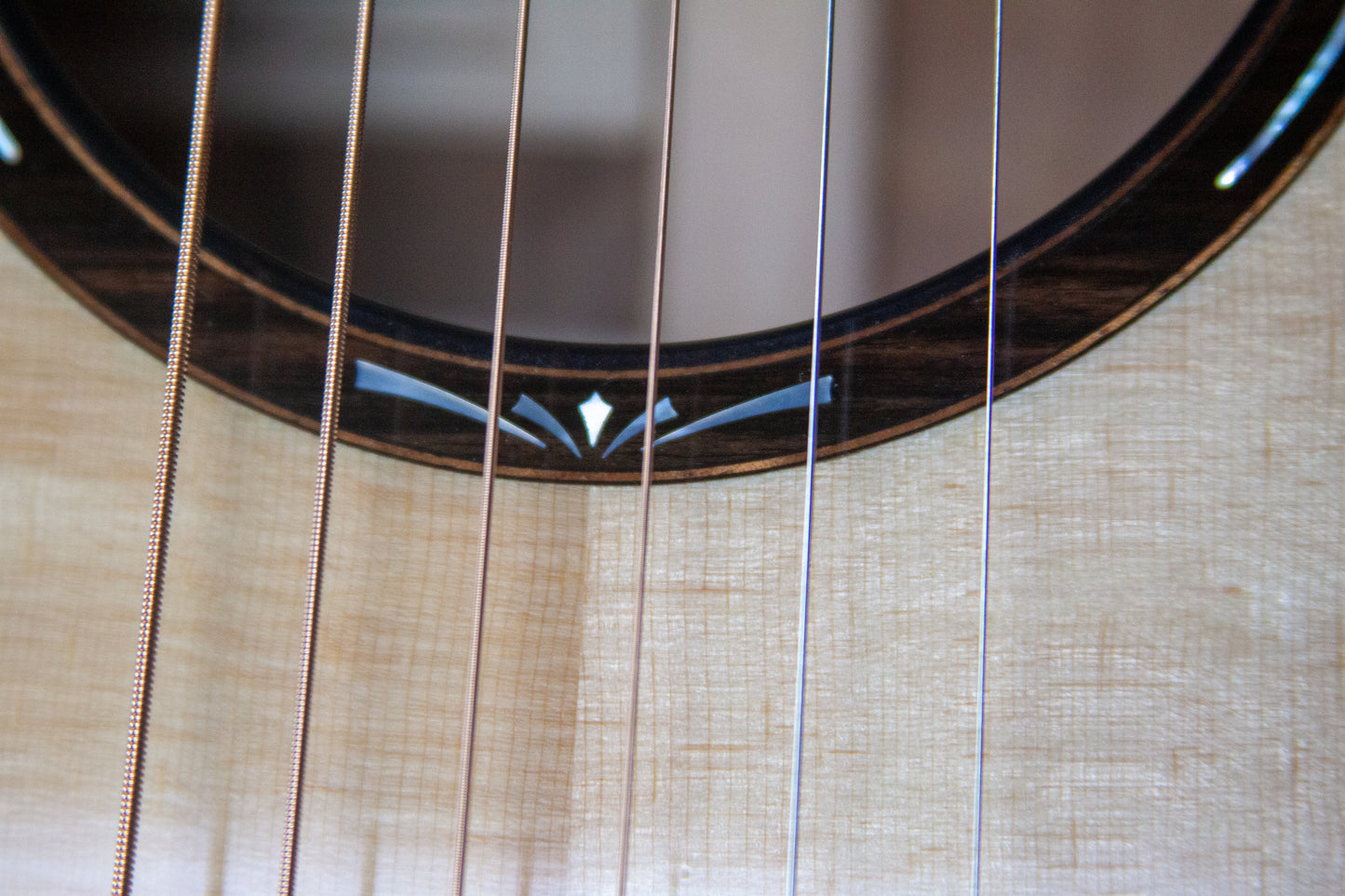 The top is Bear Claw Sitka Spruce and has an art deco Mother Of Pearl Inlay in Gabon Ebony for the rosette.