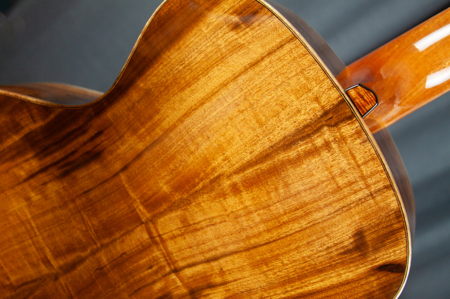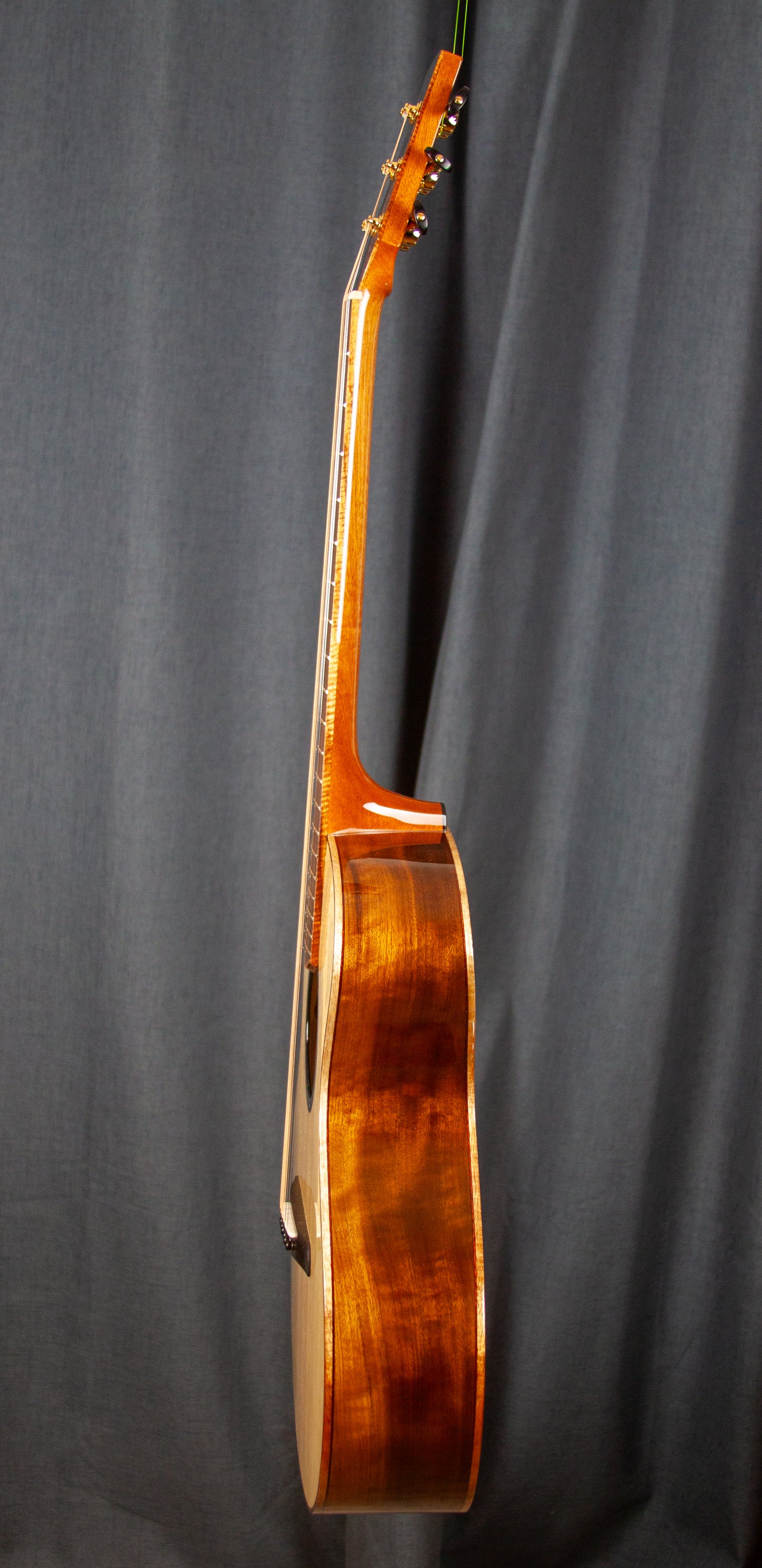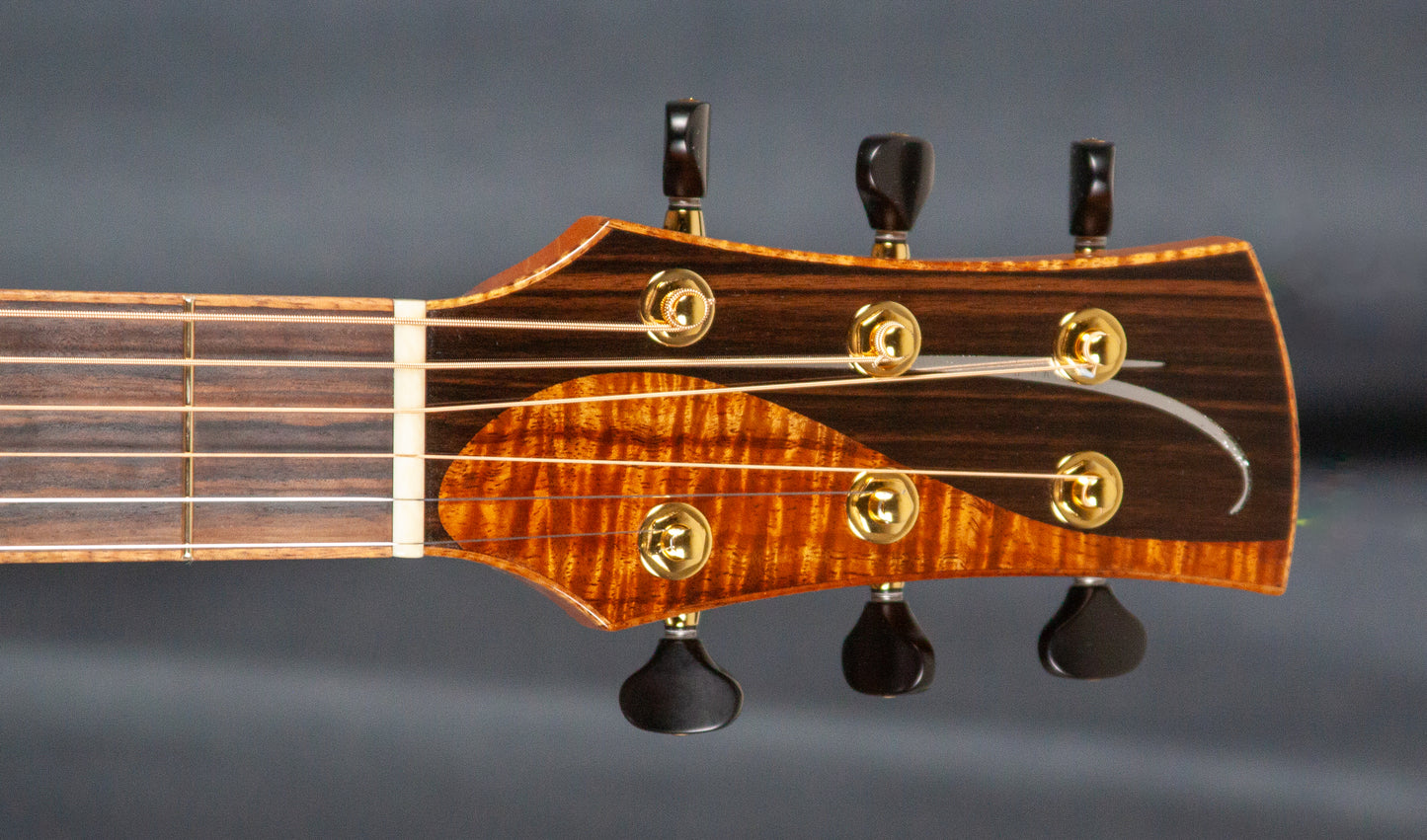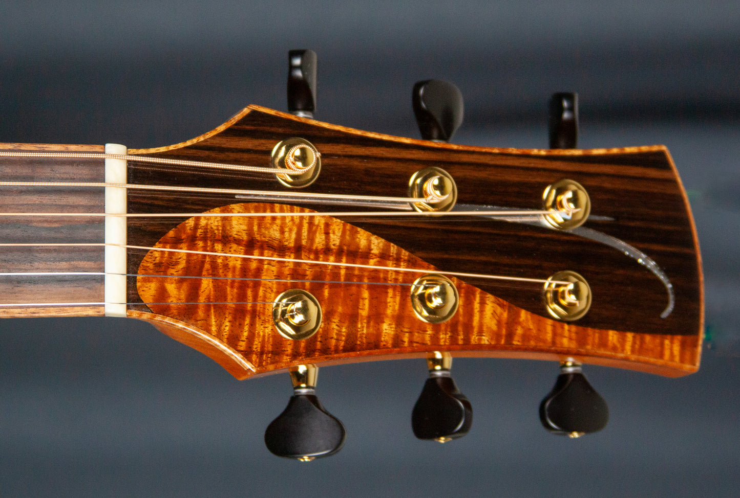 The fretboard is Papua New Guinea Striped Ebony with Figured Koa Binding. The bridge is old growth Gabon Ebony with a bone saddle.