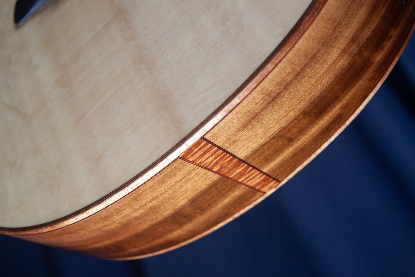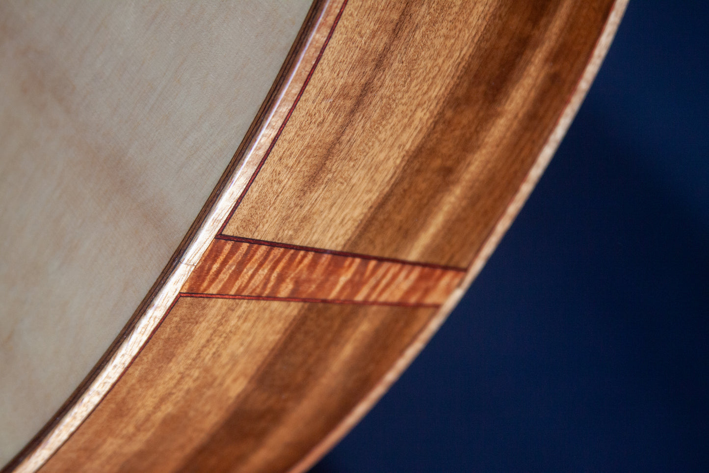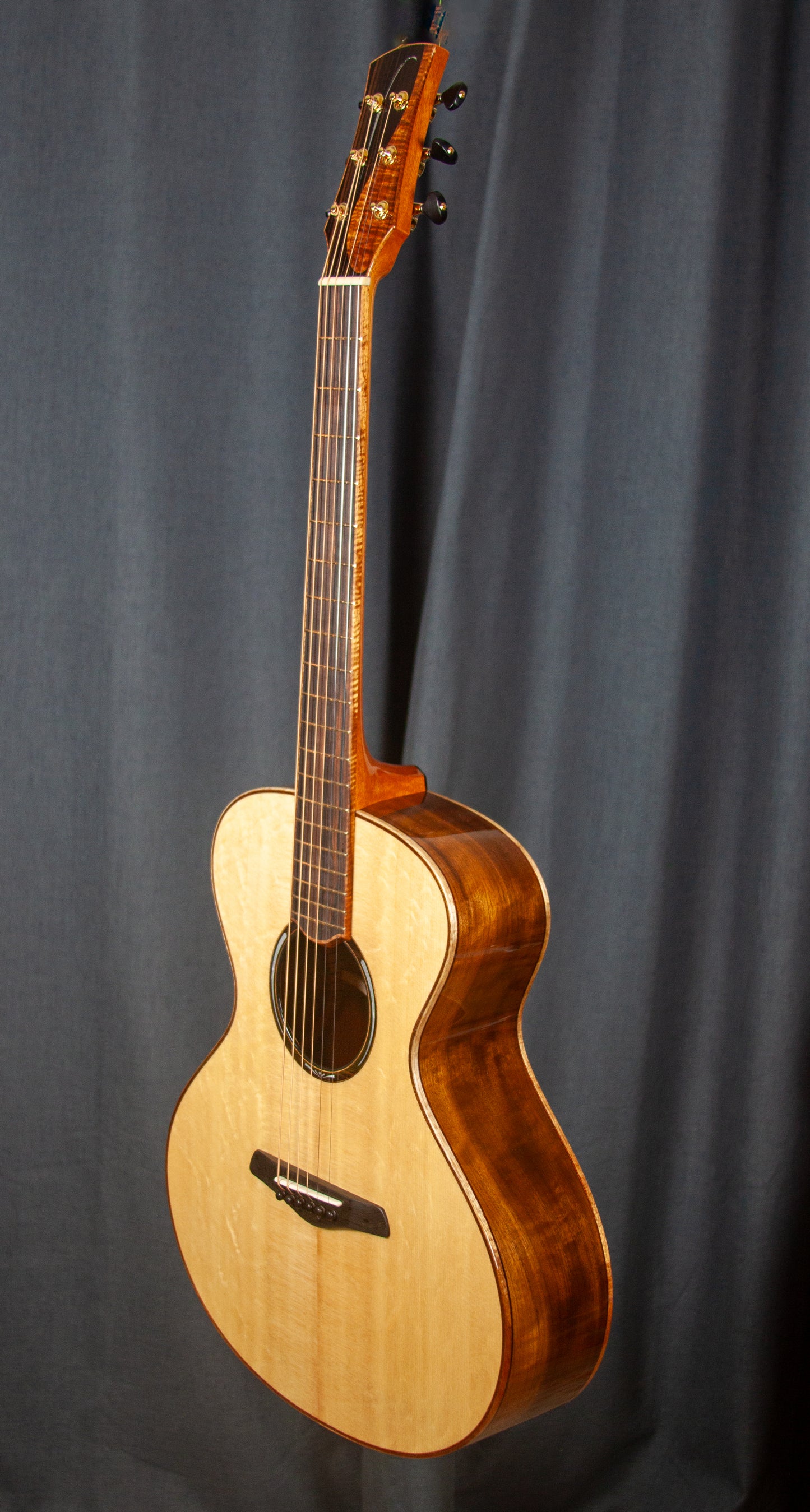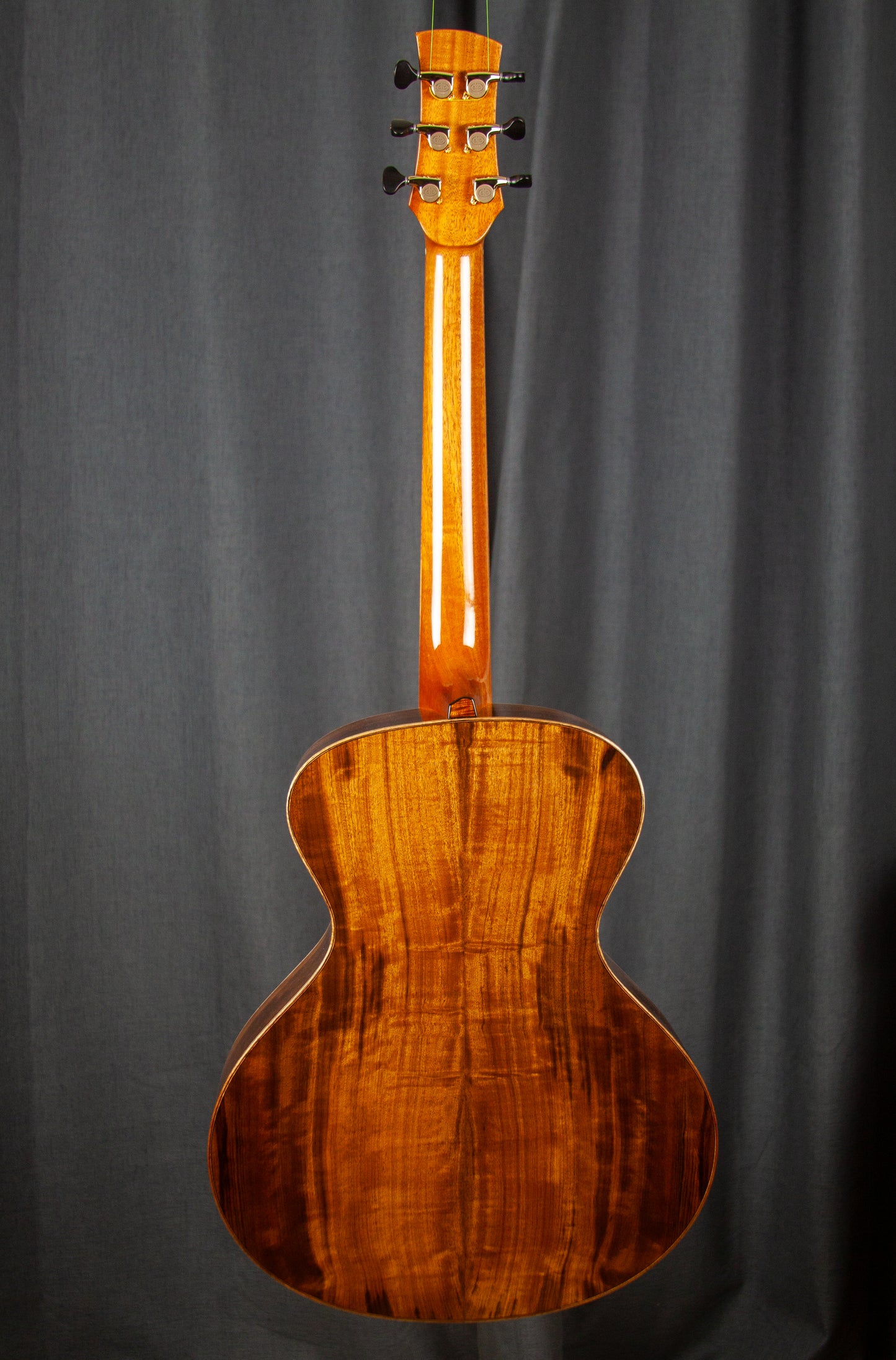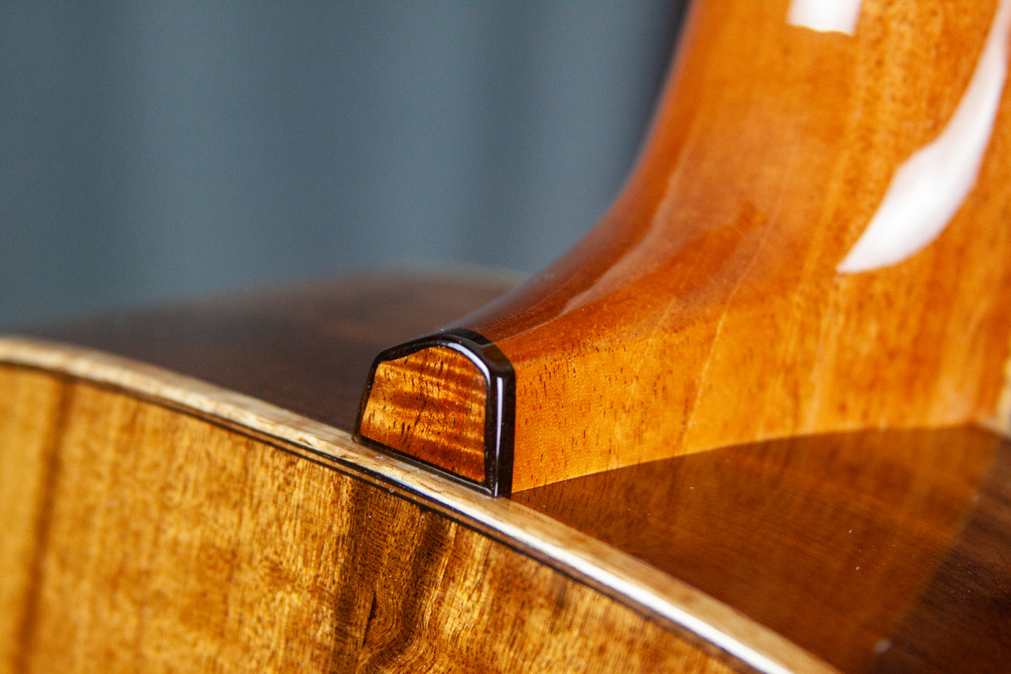 The fretboard is Papua New Guinea Striped Ebony with Figured Koa Binding. The bridge is old growth Gabon Ebony with a bone saddle.