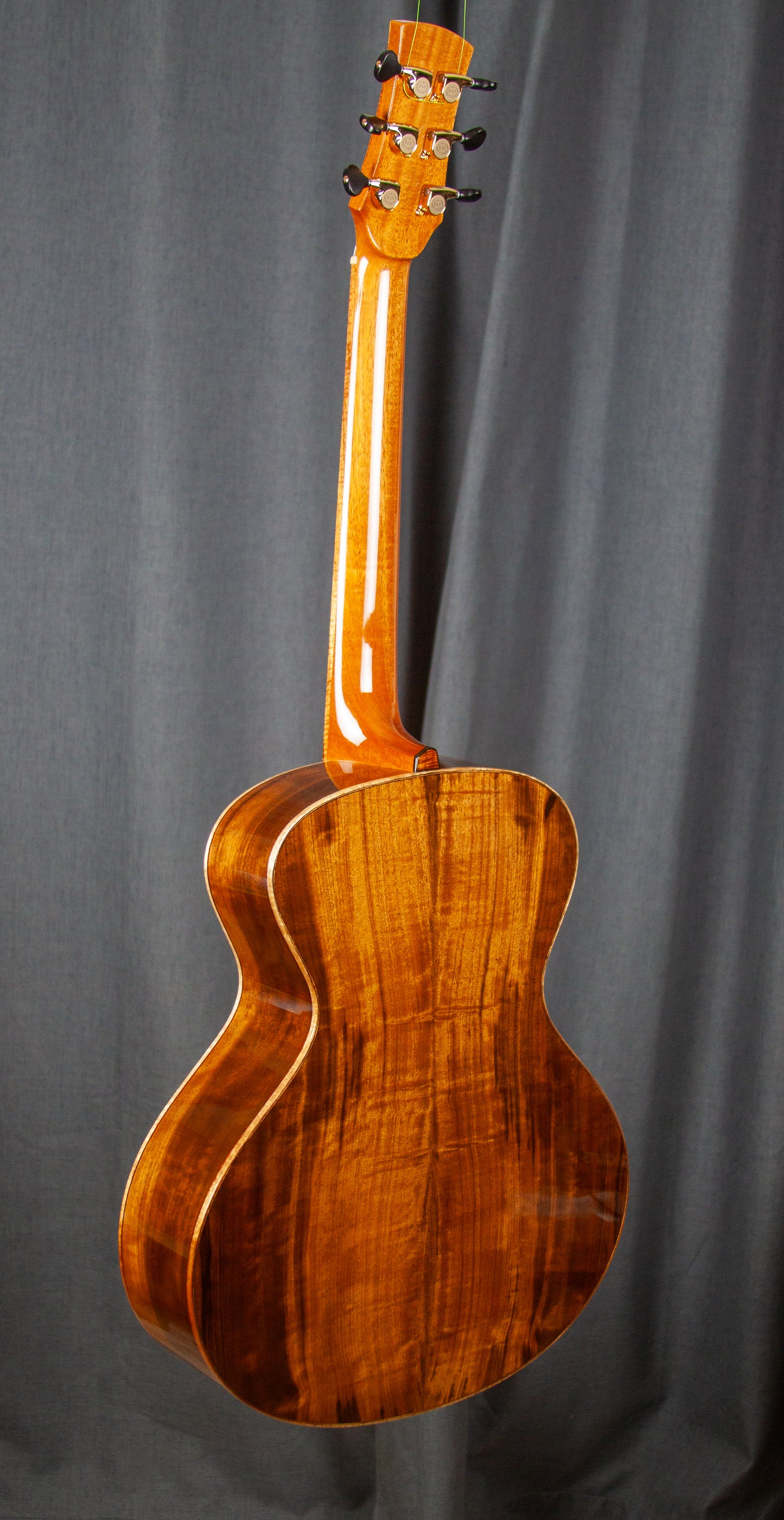 The headstock has a figured Koa inlay with mirrored acrylic trim accent and is bound in figured Koa.