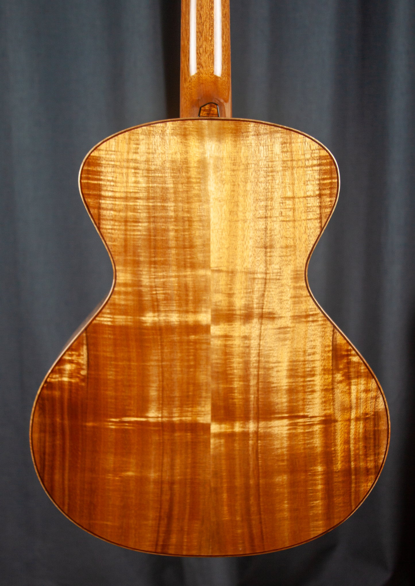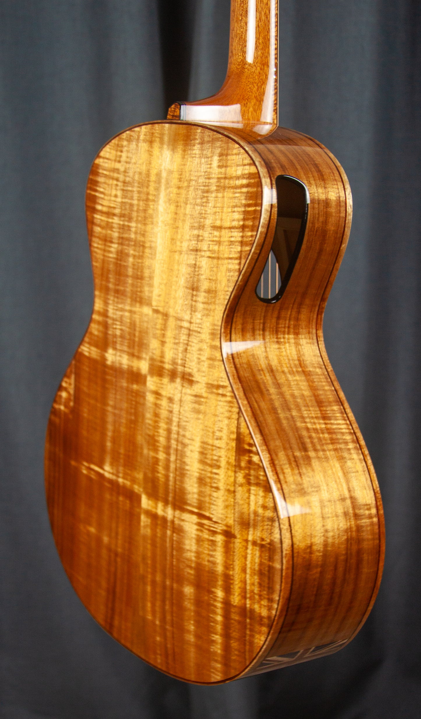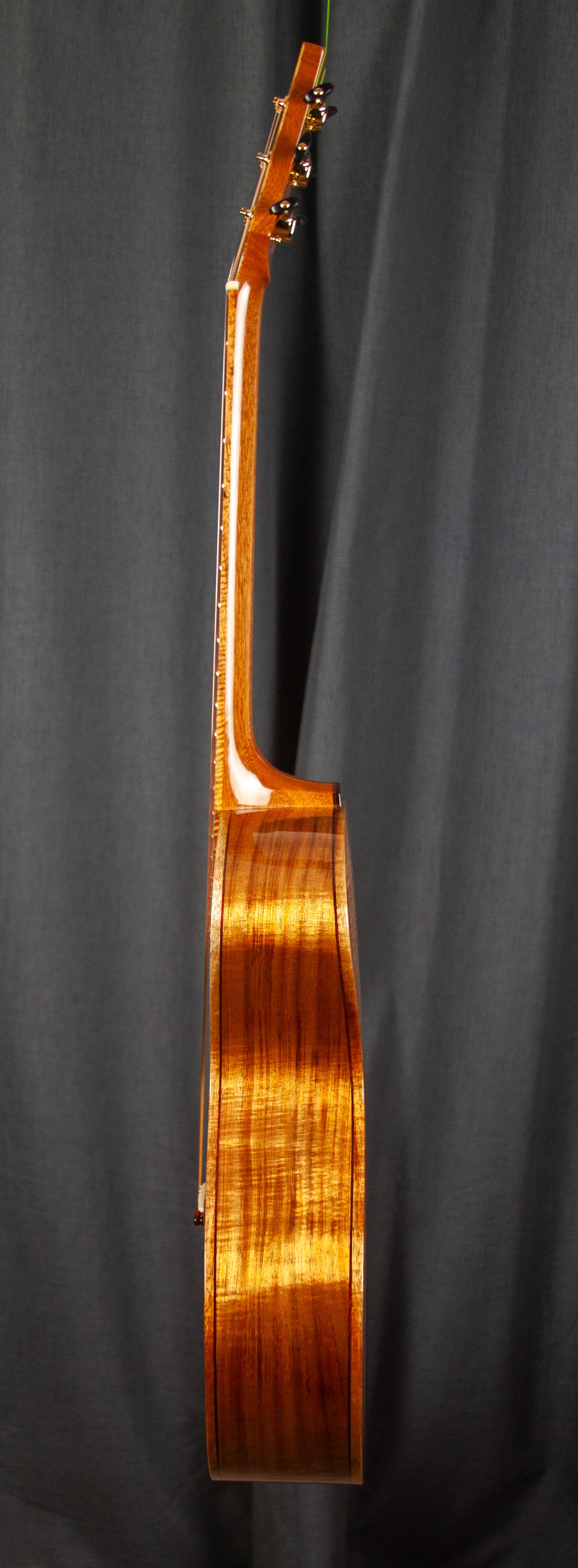 This stunning example of Fiddleback Koa showcases beautiful shimmering golden hues that capture the essence of the delicate beauty of Koa. This instrument is designed to pay tribute to one of the most iconic cars filmed on the big screen, the Aston Martin DB5.