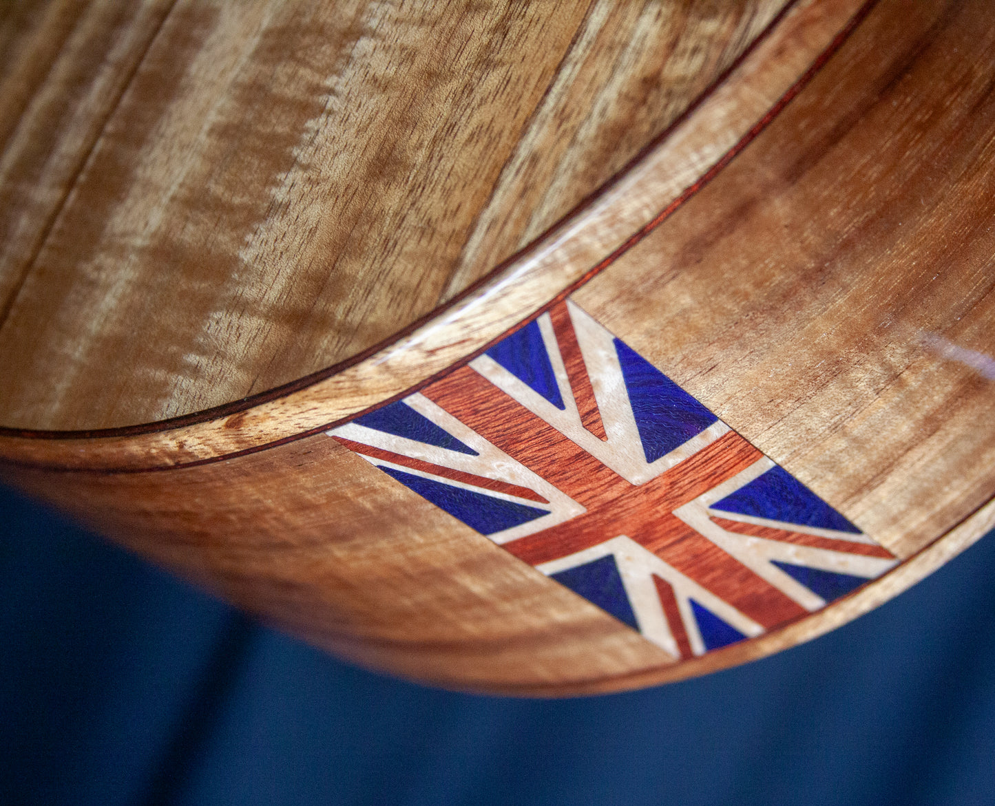 The bass side showcases a sound port that is inspired by the side vent of the DB5 as well as a custom curved inlaid Union Jack crafted from Bloodwood, Birdseye Maple and Blue Micarta.