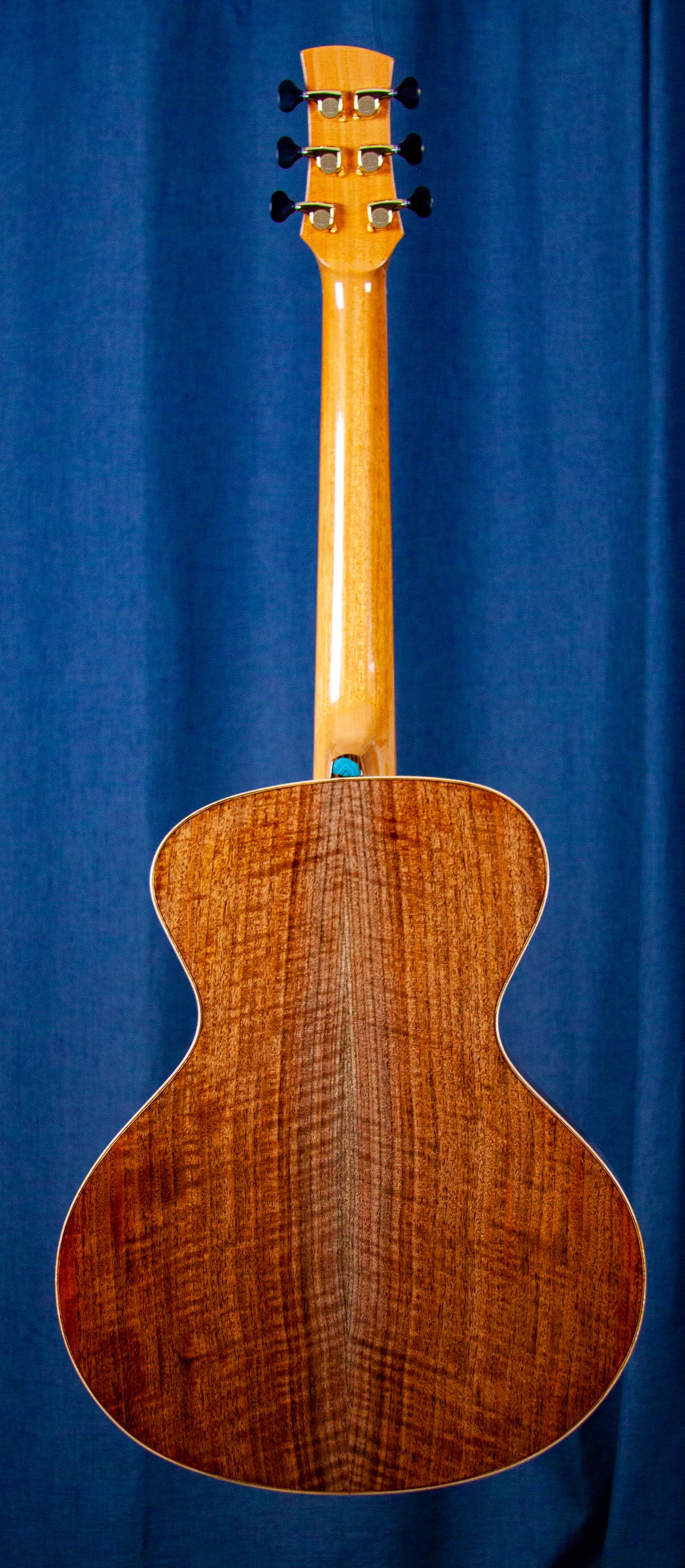 The body is bound in Birdseye Maple and the purfling chosen for the top and back is figured Koa. Birdseye Maple is known for its micro knots all over the wood creating the illusion of a bird's eye.