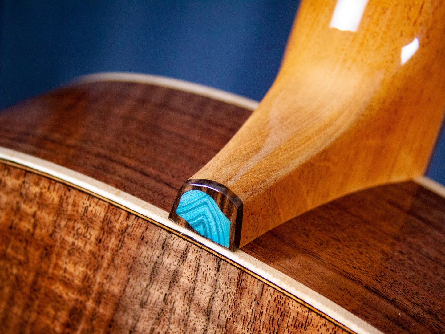 The end wedge is a very unique accent at the base of the body. The inlay material is G-Carta, a compressed fiber and epoxy material with Padauk wood purfling.